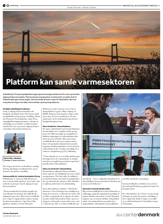 Kobler fjernvarmeselskaber sig på, giver det deres erhvervskunder mulighed for – langt nemmere end tidligere – at indsamle og behandle data til fx ESG-rapportering. ”Vi kan allerede nu se, at en fælles platform gør det langt lettere for virksomheder at arbejde med deres energiforbrug og finde besparelser,” fortæller Søren Skov Jakobsen, CEO i Center Denmark. Læs mere om platformen og potentialet i denne advertorial i Børsen.